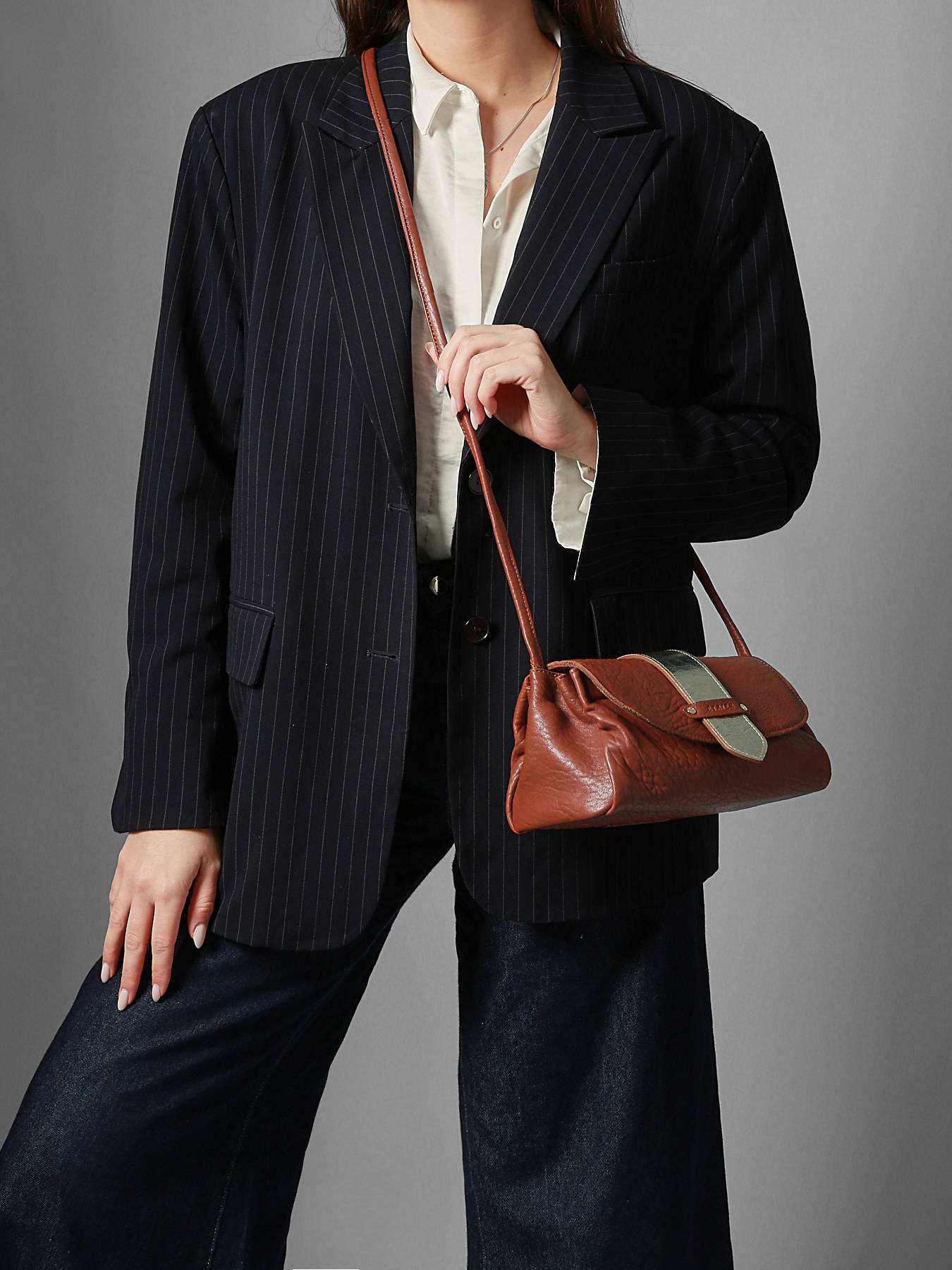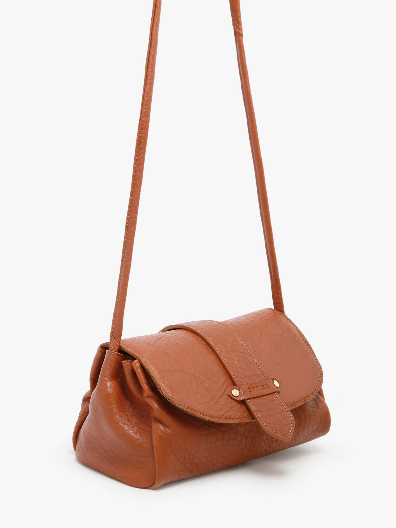 The AGNES crossbody bag by ETRIER is crafted from French crinkled lambskin leather. This model is shown here in size M and features a flap closure secured with a magnetic snap button. It is also available in size S for those who prefer a more generous capacity.